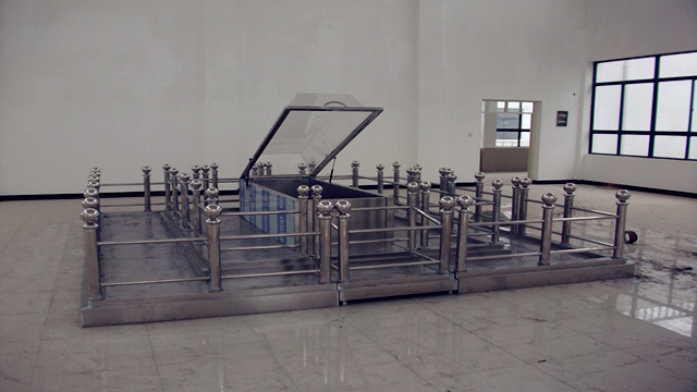 優(yōu)質(zhì)不銹鋼雙層圍欄,內(nèi)設(shè)不銹鋼平臺,綠色草坪,特制液壓升降式透明高罩